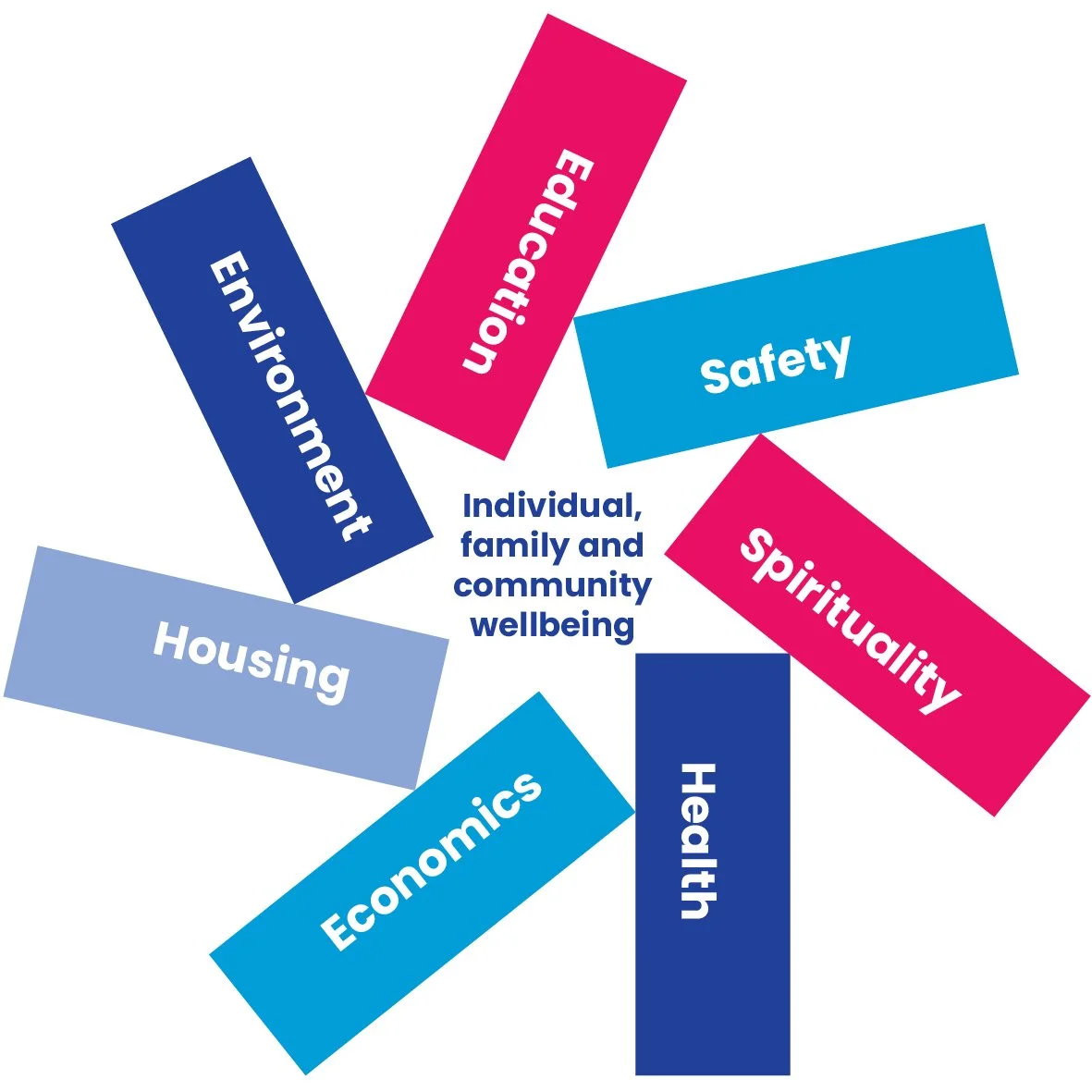 At Social Impact Strategies + Solutions we use a relational wellbeing approach to articulate, drive and measure change, for good. Our Social Impact Framework developed by Belinda acknowledges the interconnectedness of all areas of wellbeing and life. To generate meaningful change we must work across 7 wellbeing domains; health, economics, environment, safety, education, spirituality and housing. This approach is illustrated in the 7 pointed star that is the logo for our organisation.